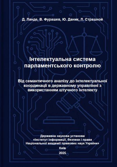 Монографію присвячено розробці нової парадигми парламентського контролю в умовах цифрової трансформації та глобальних викликів. Пропонується семантична систему інтелектуального контролю, заснована на безкодовому програмуванні через великі мовні моделі, яка переходить від простої генерації тексту до логічної формалізації, верифікації та виконання контрольних запитів. У роботі інтегровано досягнення штучного інтелекту, юриспруденції, інформаційних технологій, конфліктології, семантичного інжинірингу та кібербезпеки, що дає змогу формувати динамічні семантичні мережі знань, прогнозувати наслідки політичних рішень та виявляти конфлікти, спричинені застосуванням ШІ.